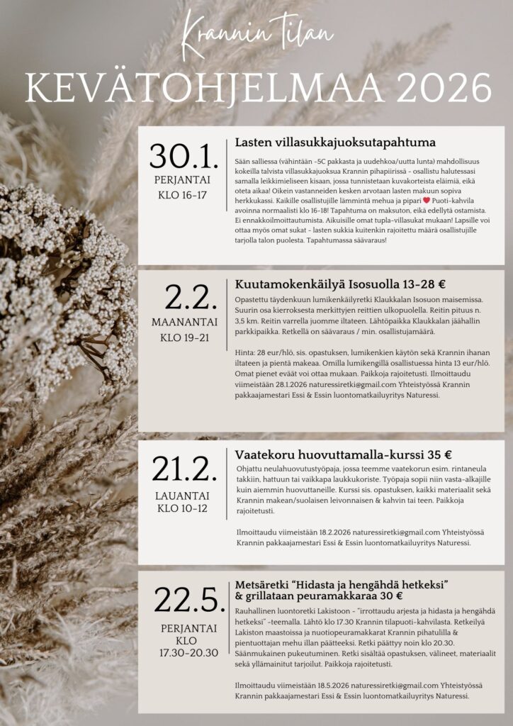 Krannin kahvila ja tilapuoti palvelee kevätkaudella 2026 perjantaisin klo 16-18 & lauantaisin klo 11-15! Ota talteen alta tapahtumakalenterimme ja tule osallistumaan!