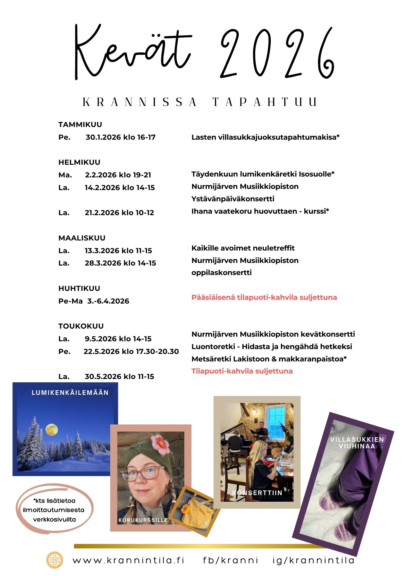 Lämpimästi tervetuloa osallistumaan Krannin kevätkauden 2026 tapahtumiin! Tulossa ihania tapahtumia, mukavia kohtaamisia ja virkistystä kaikille aisteille!