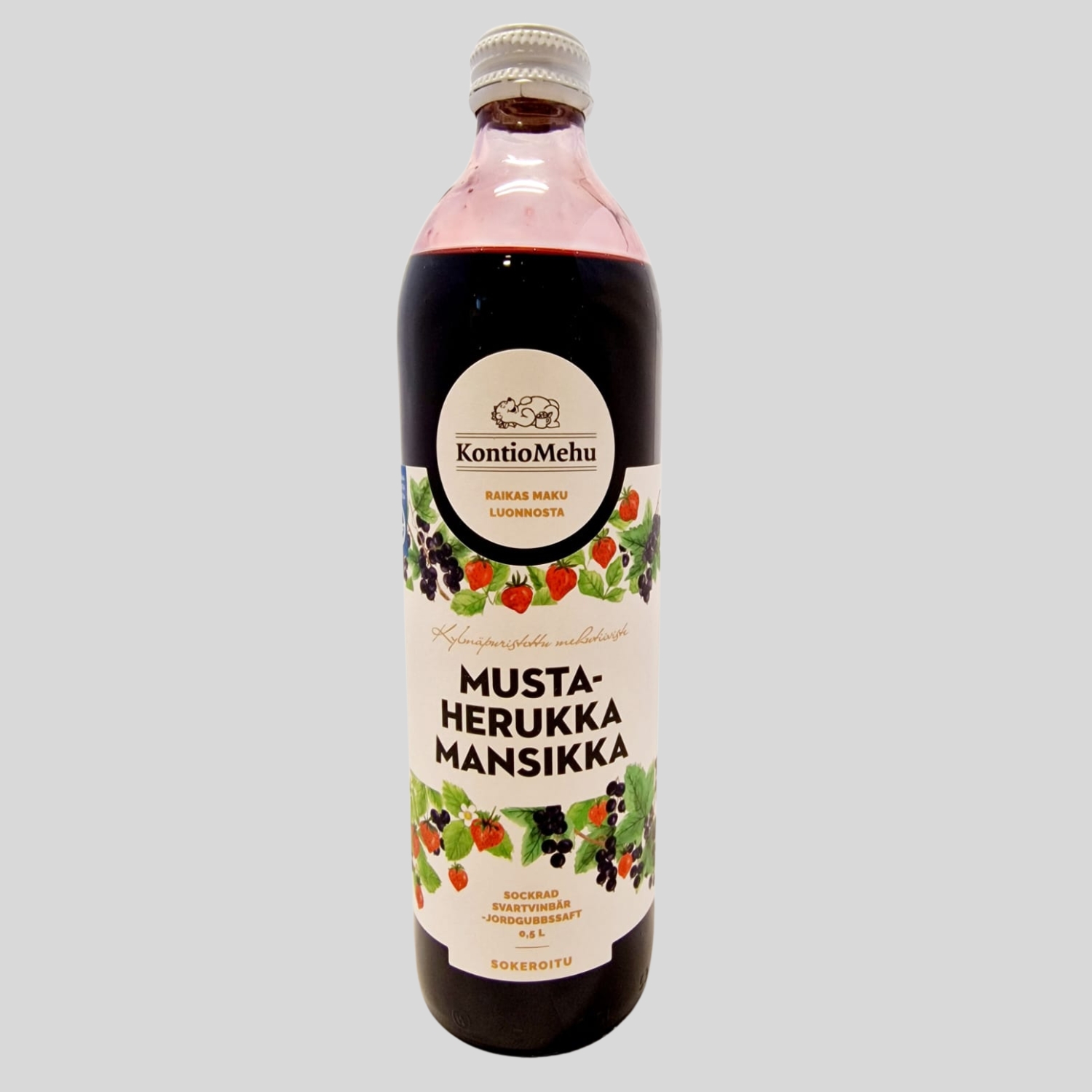 Kontiomehun, Joensuussa valmistama kylmäpuristettu laadukas mustaherukka-mansikkatäysmehu on valmistettu luonnon omista marjoista ilman keinotekoisia makeutusaineita! Riittoisa pullo – lisää 1 osa mehua, 3 osaa vettä. Täysmehupitoisuus 68 %.