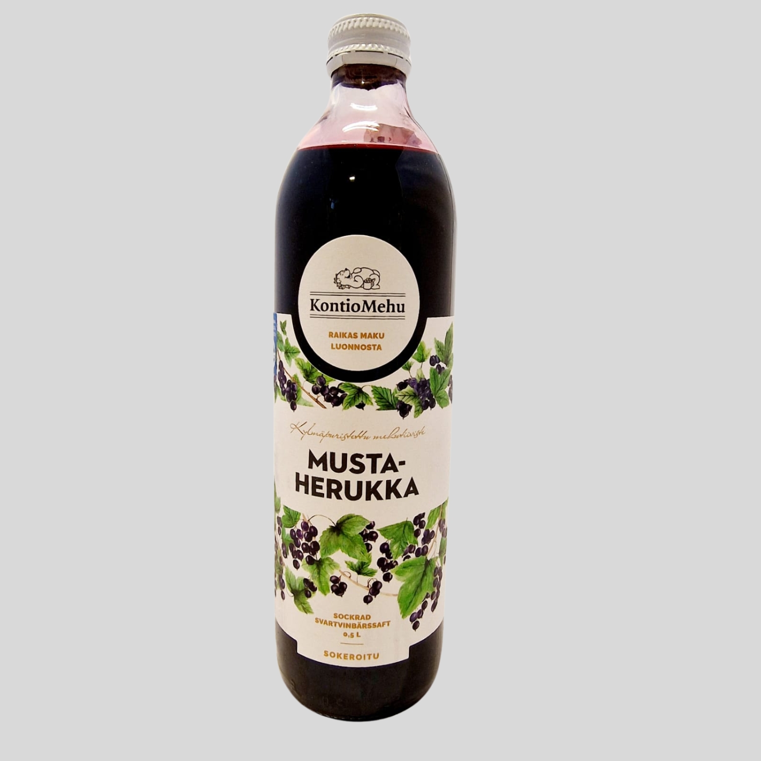 Kontiomehun, Joensuussa valmistama kylmäpuristettu laadukas mustaherukkamehu on valmistettu luonnon omista marjoista ilman keinotekoisia makeutusaineita! Riittoisa pullo – lisää 1 osa mehua, 3 osaa vettä. Täysmehupitoisuus 68 %.