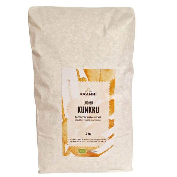 KUNKKU-täysjyväkaurahiutale© on huippusuosittu ja terveellinen kaurahiutale Krannin tilan omasta kauramyllystä. Kunkku on kooltaan isohiutaleinen ja hyvin koossa pysyvä kaurahiutale, joka sisältää terveysvaikutteisen tumman leseen! Hiutaleet ovat höyryttämättömiä, esikäsittelemättömiä ja erittäin maukkaita ja terveellisiä. Kaurahiutaleet soveltuvat monipuoliseen leivontaan ja ruuanlaittoon.
