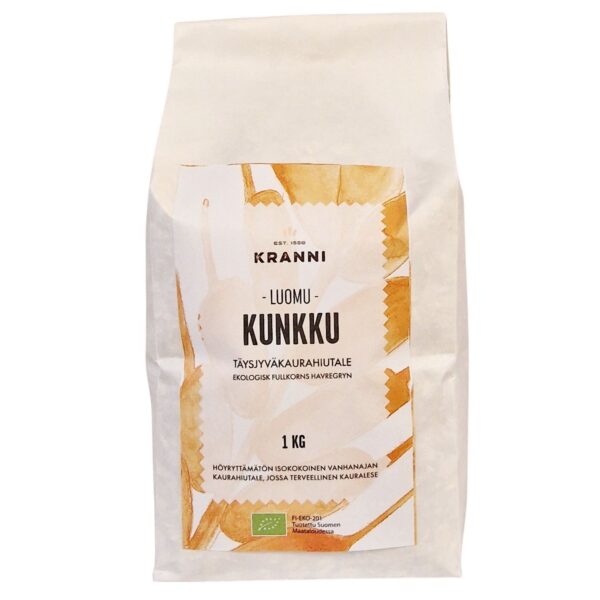 KUNKKU-täysjyväkaurahiutale© on huippusuosittu ja terveellinen kaurahiutale Krannin tilan omasta kauramyllystä. Kunkku on kooltaan isohiutaleinen ja hyvin koossa pysyvä kaurahiutale, joka sisältää terveysvaikutteisen tumman leseen! Hiutaleet ovat höyryttämättömiä, esikäsittelemättömiä ja erittäin maukkaita ja terveellisiä. Kaurahiutaleet soveltuvat monipuoliseen leivontaan ja ruuanlaittoon.